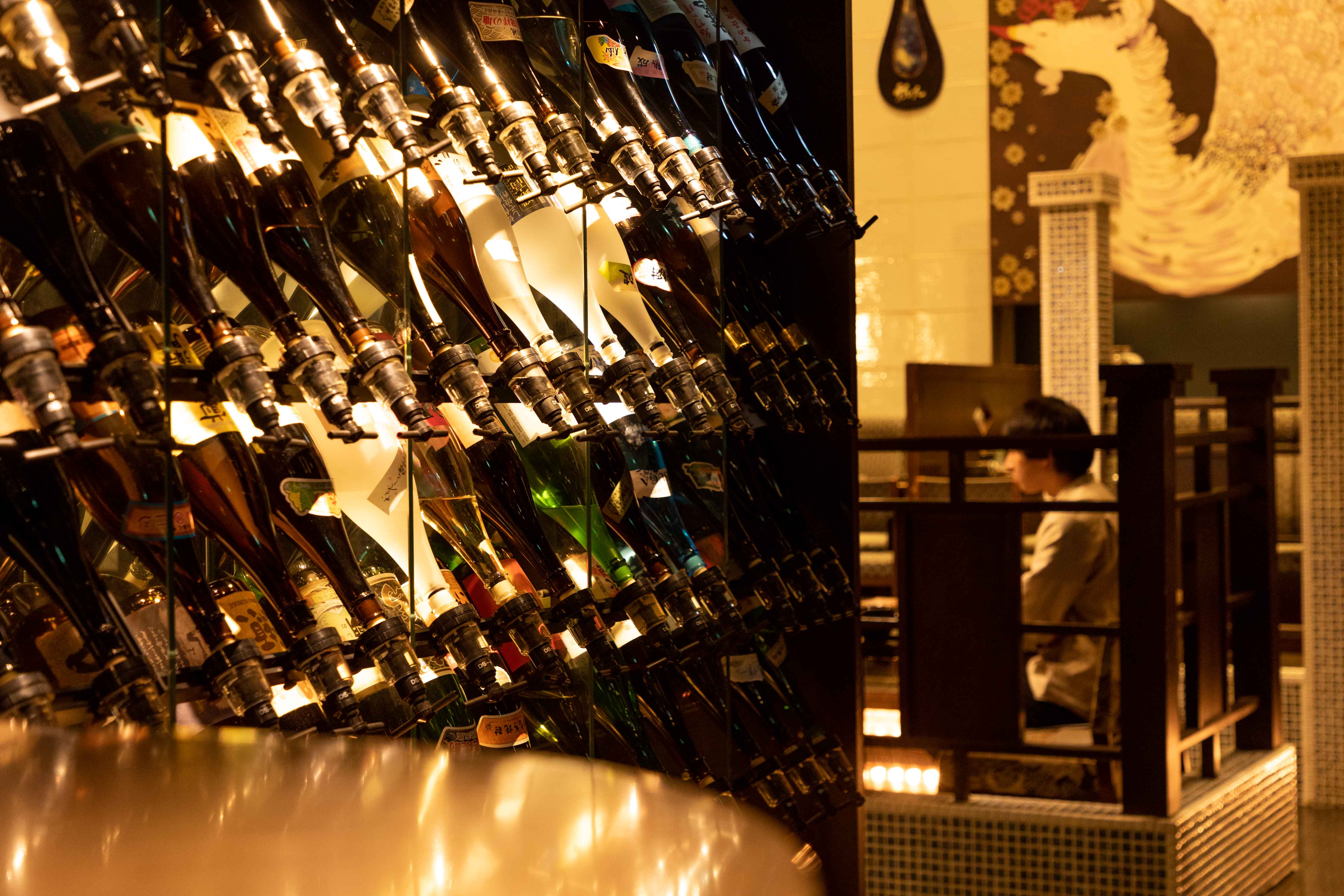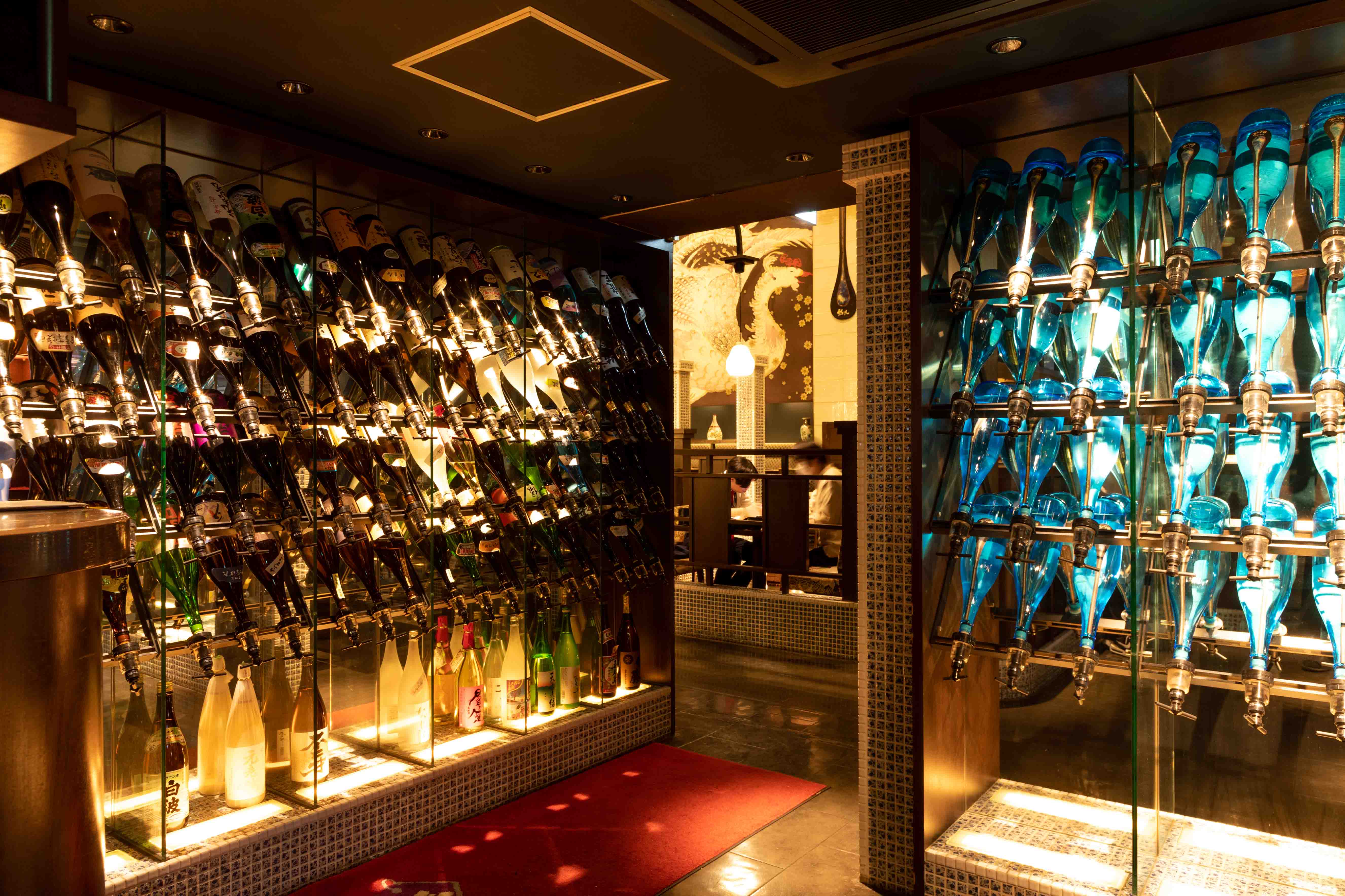 九州の「うまかもん」と一緒に味わう豊富なドリンク。入口から見える焼酎セラーでお好みの焼酎を見つけることも楽しみの1つ。